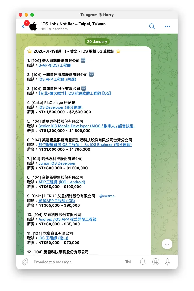 iOS/Android/Flutter 每日自動職缺通知(Telegram Public Free Channel),幫你抓住最新工作機會