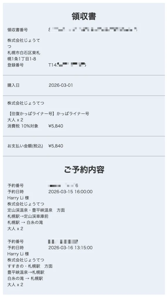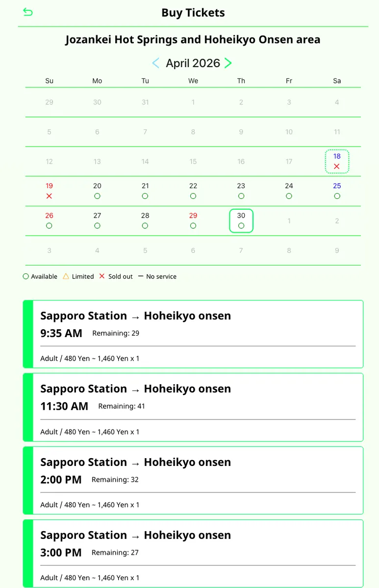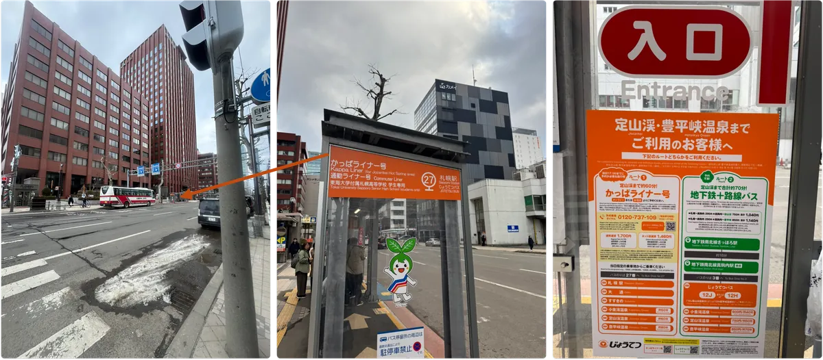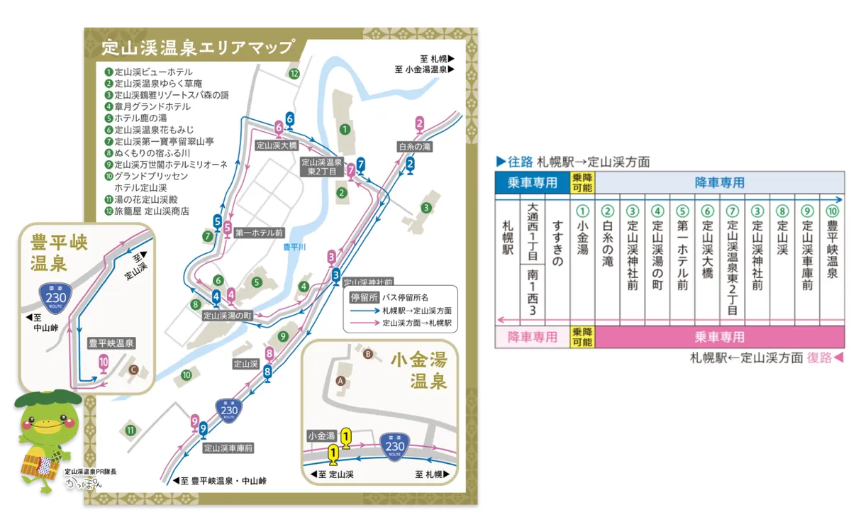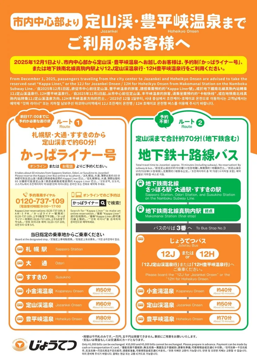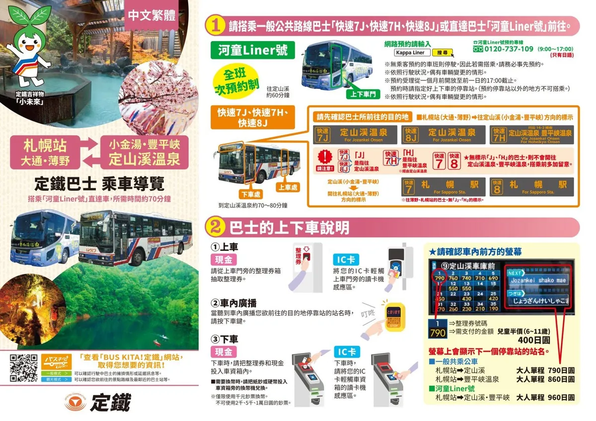 - [需預約] [約 60 分鐘] 札幌車站 → 搭乘 Kappa Liner 巴士 → 定山溪溫泉。 點此查看時刻表
