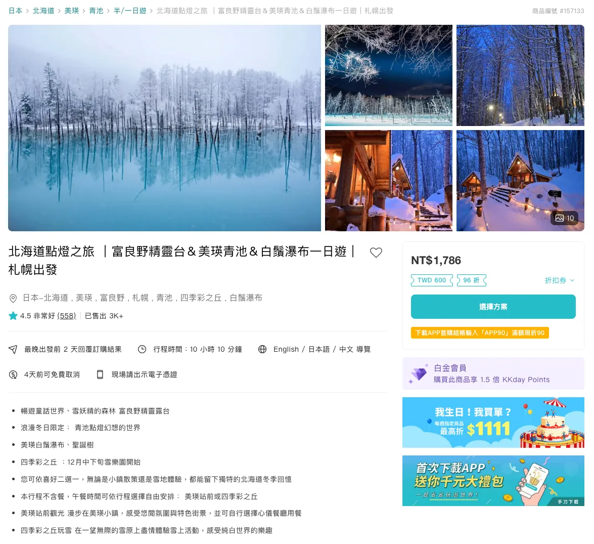 KKday 一日遊:北海道點燈之旅 |富良野精靈台&美瑛青池&白鬚瀑布一日遊|札幌出發