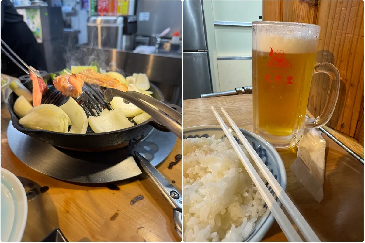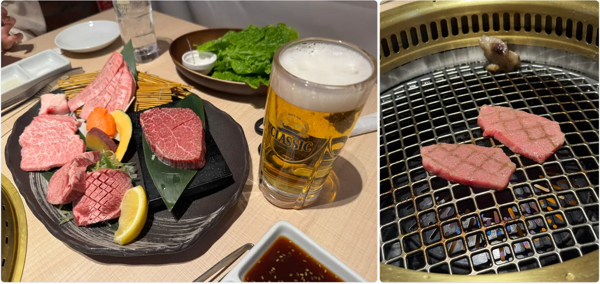 點了北海道牛套餐+生菜+啤酒+飲料+冷麵,總共約 NT$3,100;和牛油脂豐富入口即化,牛排也很好吃,最驚豔的是牛舌,很 Q 很好吃。