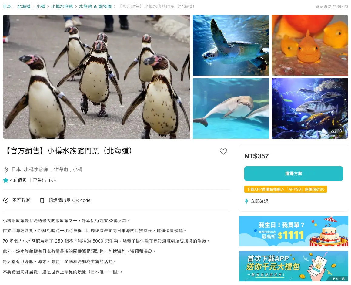 KKday — 【 官方銷售】北海道小樽水族館門票 (即買即用/購票後 30 天內都可使用)