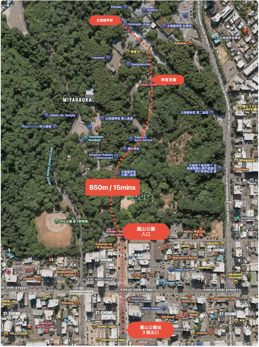 圓山公園站 3 號出口出來直接朝面公園的方向往裡面走就是北海道神宮了。