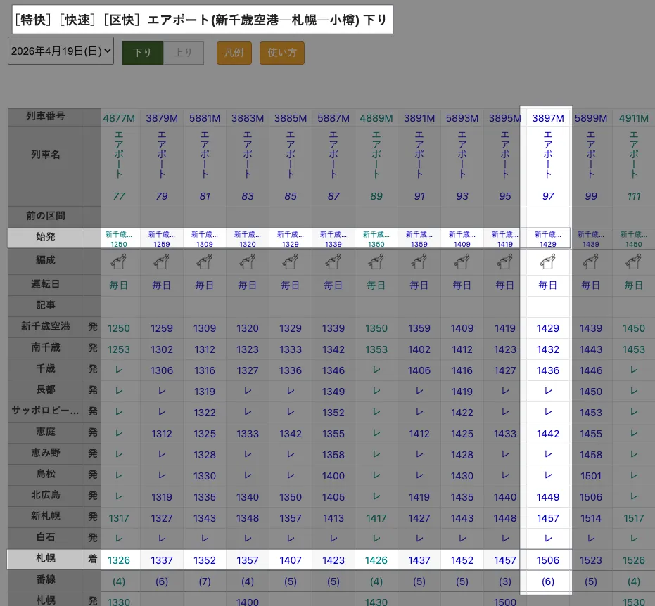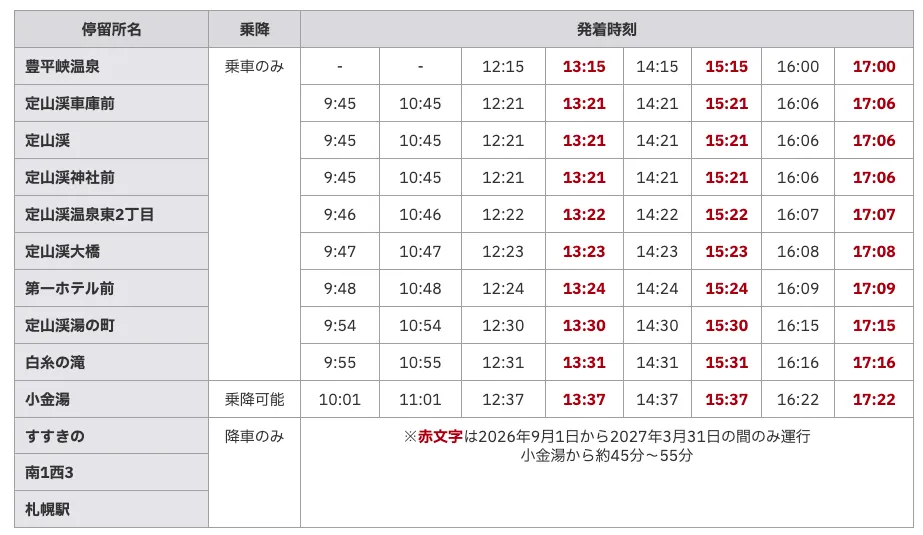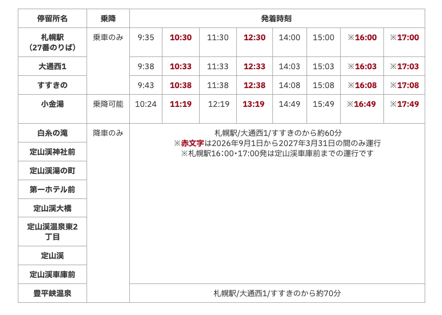 - 要注意 紅色字的班次只有秋冬季有行駛 、札幌站 16:00/17:00 發車的班次只開到定山溪車庫前。