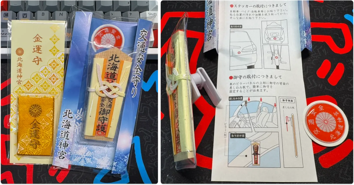 買了兩個御守,比較特別的是交通御守,可以掛在車內跟有一個貼紙可以貼在機車、腳踏車、安全帽上。