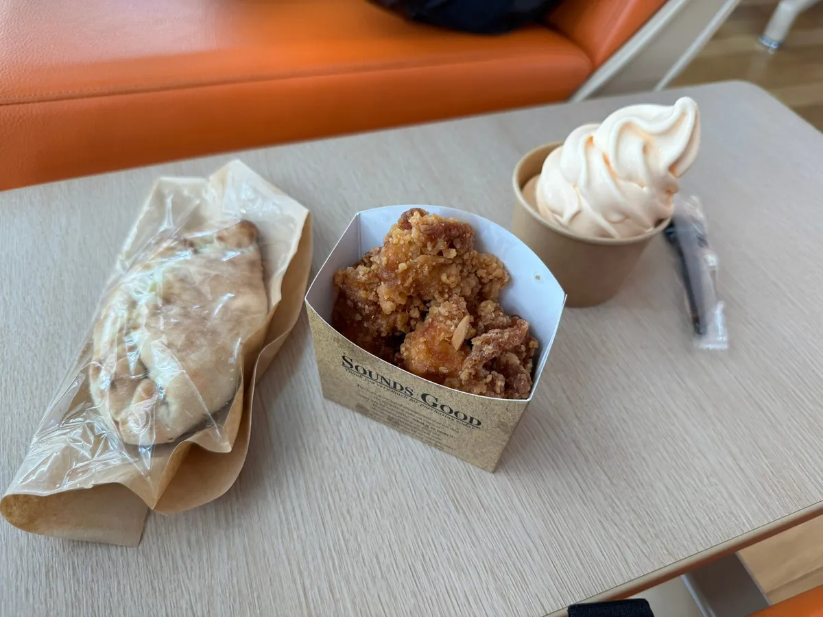 有一條美食街可以吃東西,我只買了麵包、炸雞、哈密瓜冰淇淋加減吃一點。