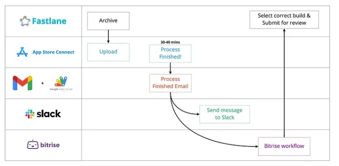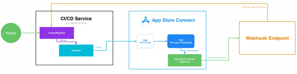 - App Store Connect Build Process Complete 後會發 Webhook 通知,我們收到通知後再繼續執行送審步驟。