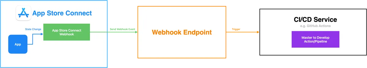 - 有了 Webhook 之後,可以直接在收到 App 發布通知後觸發 CI/CD Action (Master to Develop)。