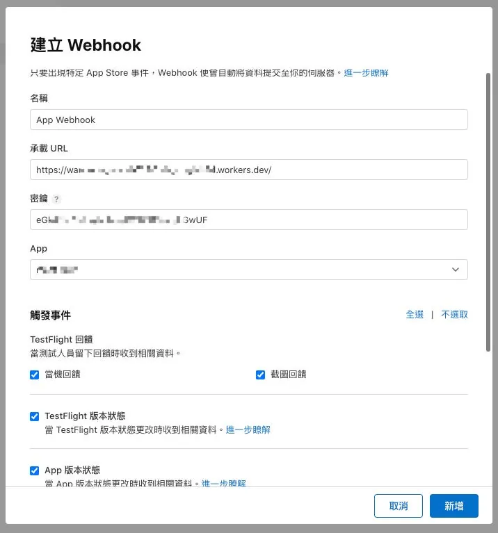 - App:選擇預接收 Webhook 通知的 App
