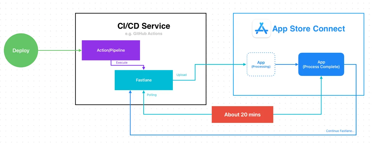 以往在實現 App CI/CD 打包送審時,打包上傳後 需要等待 Apple 處理完成 才能繼續送審;Fastlane 默認的做法是 Polling App Store Connect 檢查上傳的建置狀態,直到 Complete 後才會繼續執行送審 Lane。