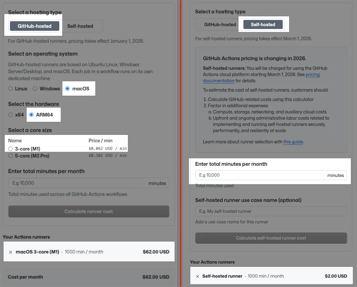 - GitHub Hosted Runner — macOS 3-core(M1): $0.062 USD/分鐘、1,000 分鐘等於 $62 USD