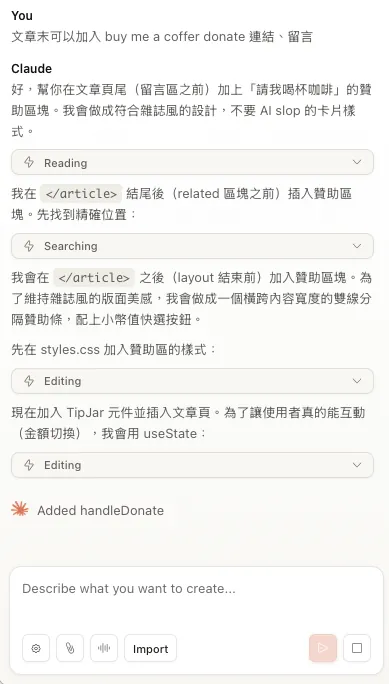 可以繼續跟 AI 對話請他加上你要的功能、調整現有功能,例如我希望文章末可以加入 buy me a coffee donate 連結、留言, 我就可以再跟他說: