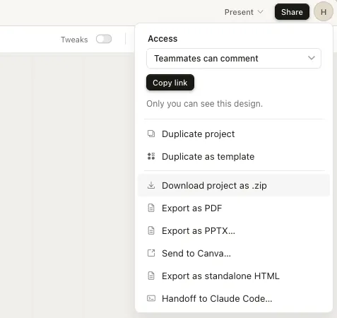 設計到滿意後,點右上角「Share」→「Download project as .zip」,將原始設計檔下載回來:
