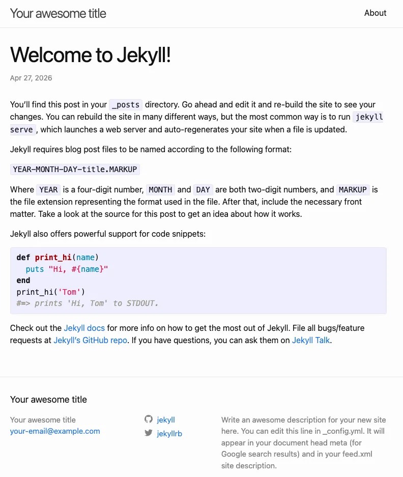 執行 bundle exec jekyll serve 打開 http://127.0.0.1:4000/ 查看結果: