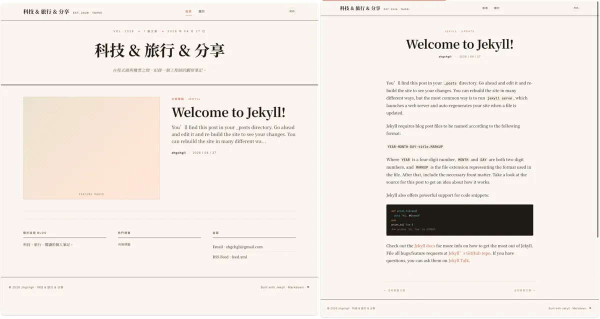 花了一個週末午後,用 Claude Design 設計喜歡的 Blog 樣式與功能,再透過 Claude Code 實作並套用回 Jekyll Blog,把用了 5 年的 Chirpy Theme 介面完美替換成我心目中理想的個人 Blog 樣式。