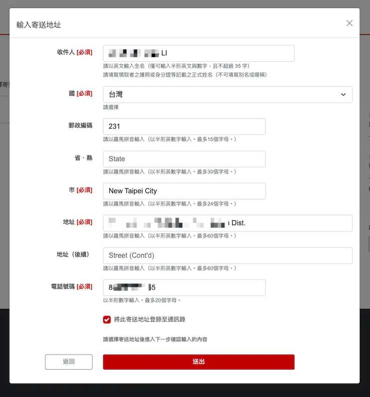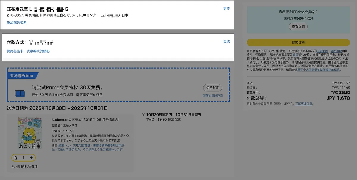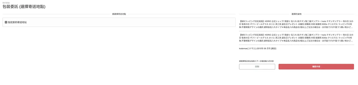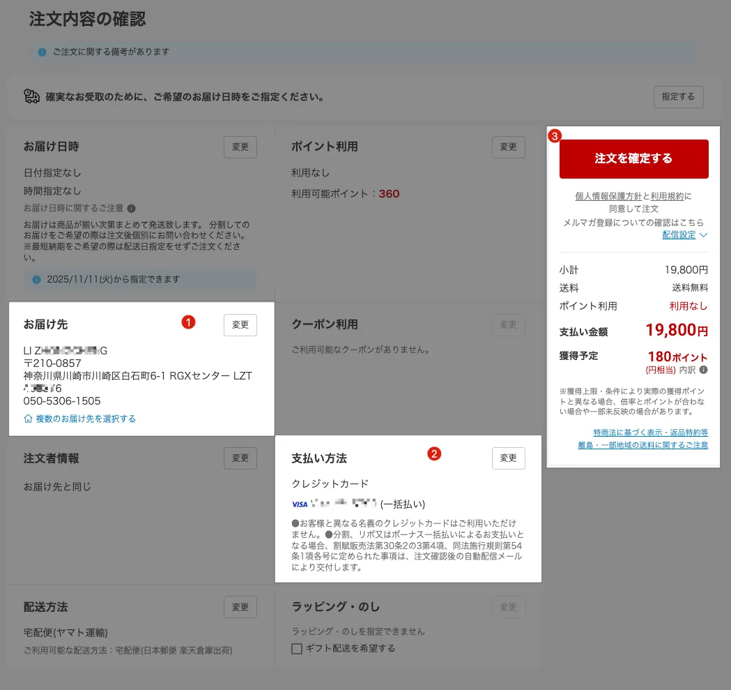 Shipping Address: For delivery information, you can directly select the newly added Rakuten forwarding address or add a forwarding address yourself (please make sure to enter the complete address including the final number).