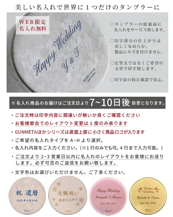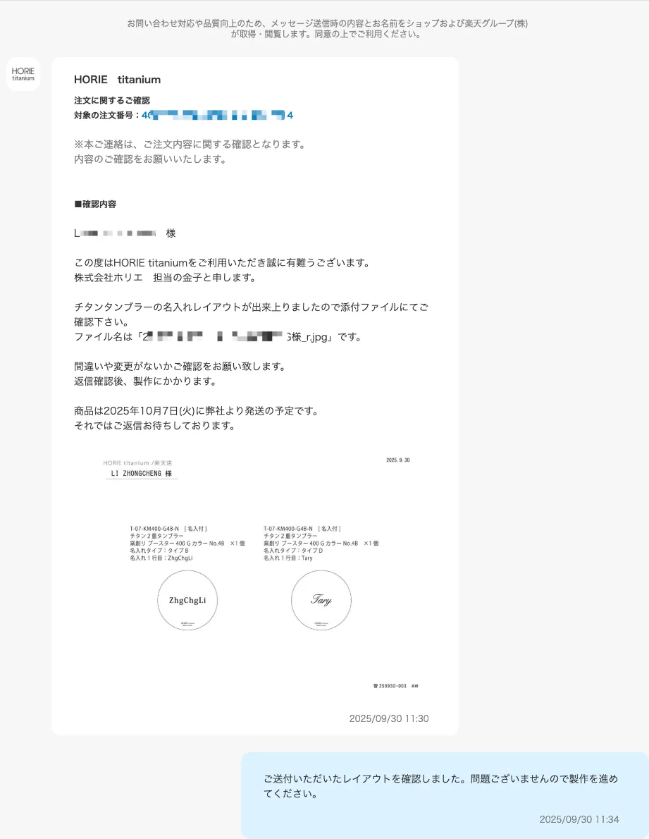 If you choose to add engraving, HORIE will send you a confirmation after receiving the order. If everything is fine, reply with “ご送付いただいたレイアウトを確認しました。問題ございませんので製作を進めてください。” to let them start production.