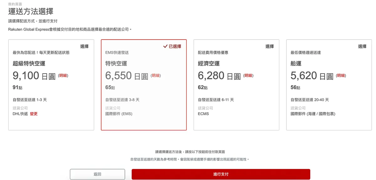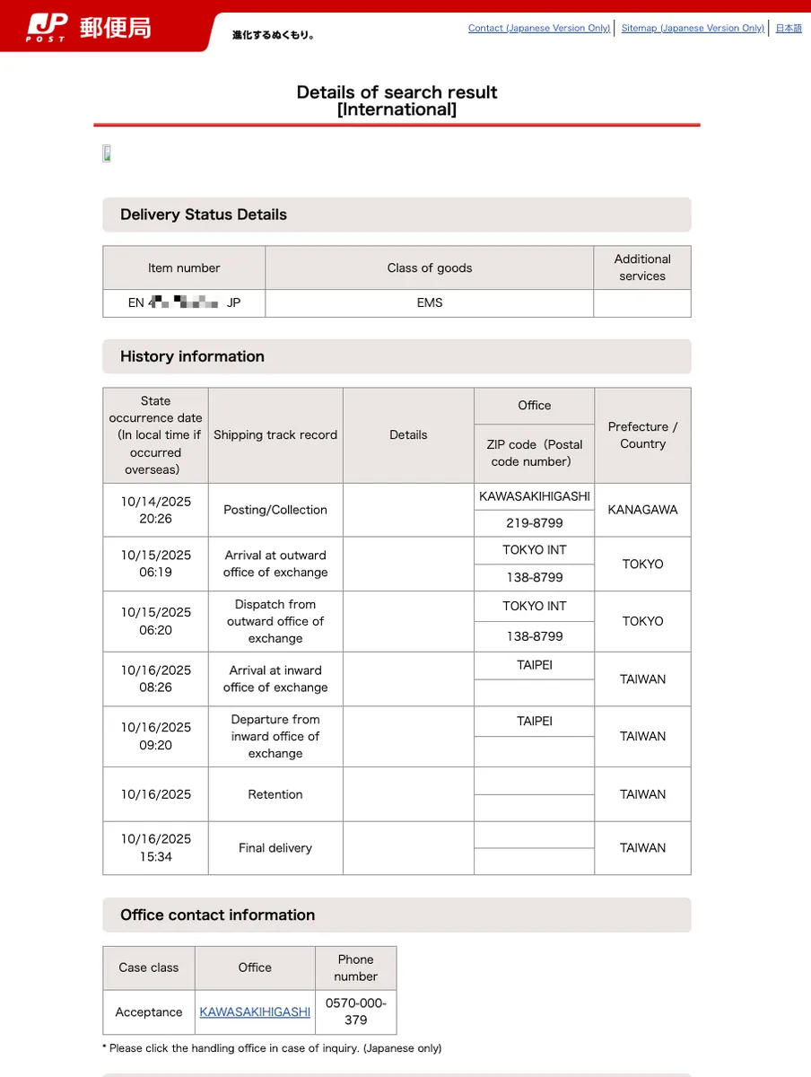According to a friend’s advice, if you use DHL, remember to apply for tax payment before delivery to avoid extra handling fees if customs inspects and charges additional duties.EMS Express Air Shipping: 3–8 days 6,550 JPY (I chose this, actually received in 2 days, very fast)