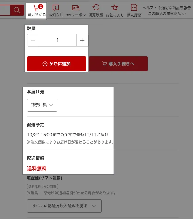 After filling in the product specifications, click “かごに追加” to add to the cart. For the delivery address, select our Rakuten Shipping’s “Kanagawa Prefecture.” Below, the estimated delivery time to Rakuten Shipping and free shipping will be shown. Once everything is set, click the cart at the top to checkout: