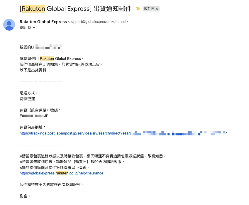 Rakuten will send a notification after shipping is completed, including a tracking number to check the package status.