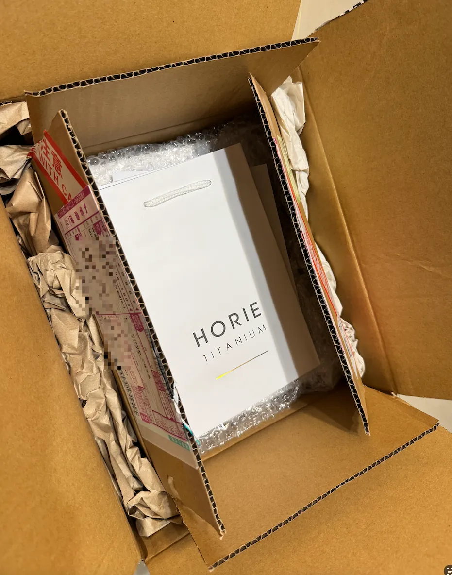 The Horie titanium cup’s original sealed box was placed intact inside the Rakuten forwarding box.