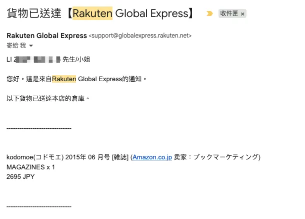 Amazon JP Purchase - Rakuten Shipping Arrival Notification