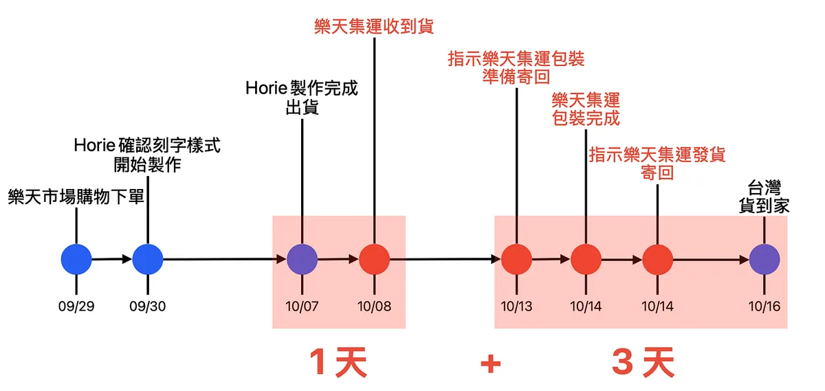 After receiving the HORIE shipping notification, it takes about 1–3 days to arrive at the Rakuten consolidation warehouse.